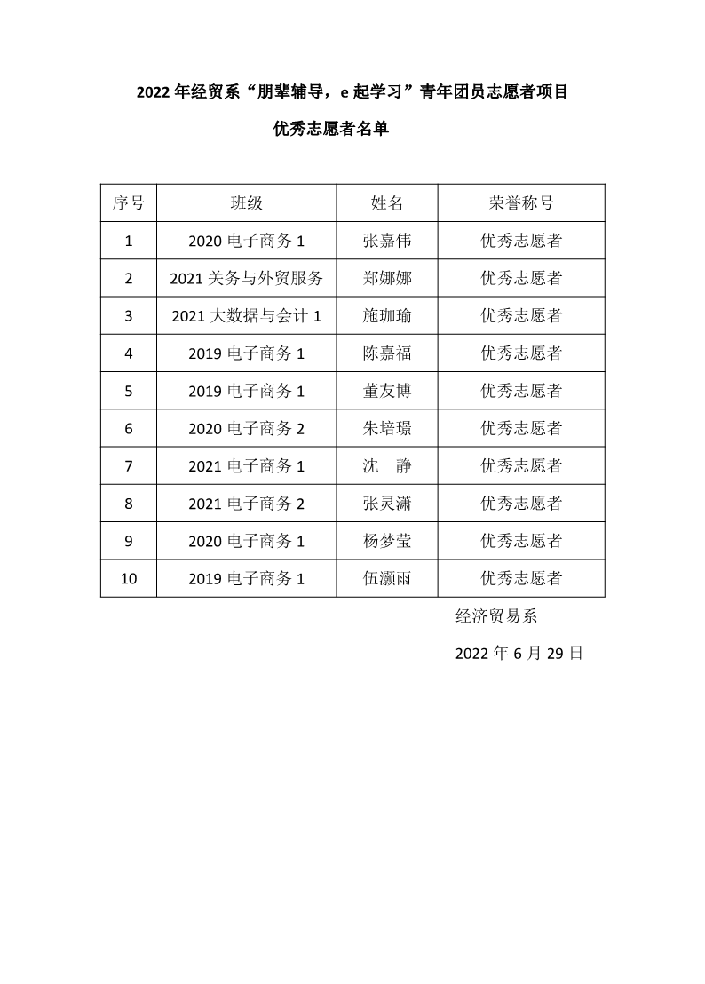 2022年经贸系“朋辈辅导,e 起学习”青年团员志愿者服务项目优秀志愿者 来源: 发布时间:2022-06-29 11:30:00 浏览次数: 次 【字体:小 大】 终审:张开大经贸系 分享到: 【打印正文】