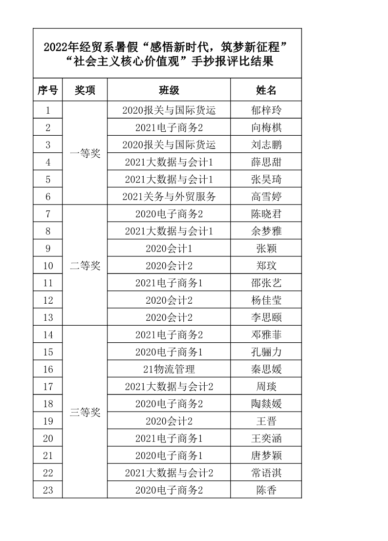 2022年经贸系暑假“感悟新时代,筑梦新征程” “社会主义核心价值观”手抄报评比结果 来源: 发布时间:2022-09-22 11:41:05 浏览次数: 次 【字体:小 大】 终审:张开大经贸系 分享到: 【打印正文】