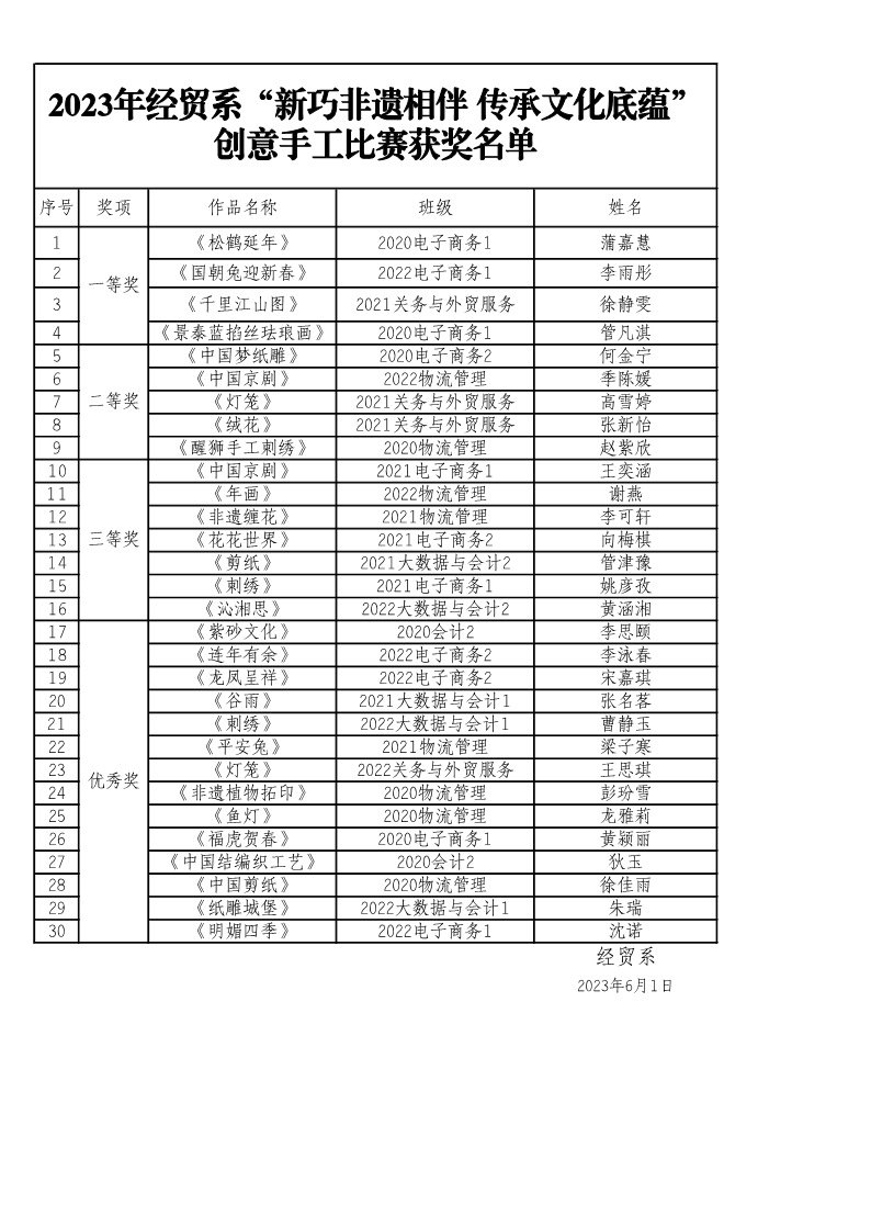 2023年经贸系“新巧非遗相伴 传承文化底蕴” 创意手工比赛获奖名单 来源: 发布时间:2023-06-01 13:12:52 浏览次数: 次 【字体:小 大】 终审:张开大经贸系 分享到: 【打印正文】